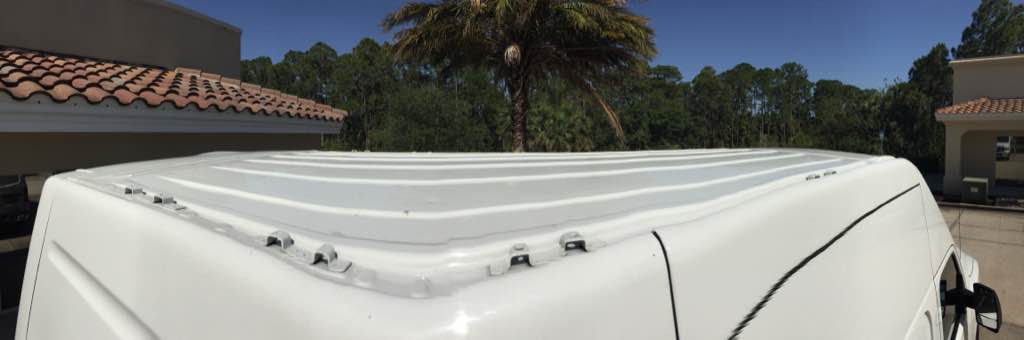 After that came time to attach the flange to the roof, I removed the painters tape, applied some (read plenty of) Dicor Butyl Tape to the bottom of the flange, placed it on the roof and applied to pressure. Since the flange was sitting between the roof ridges (I looked online for a roof adapater but couldn’t find one for the Nissan NV) after placing the flange on the roof I added more butyl tape in between the flange and the ridges to help with the sealing.